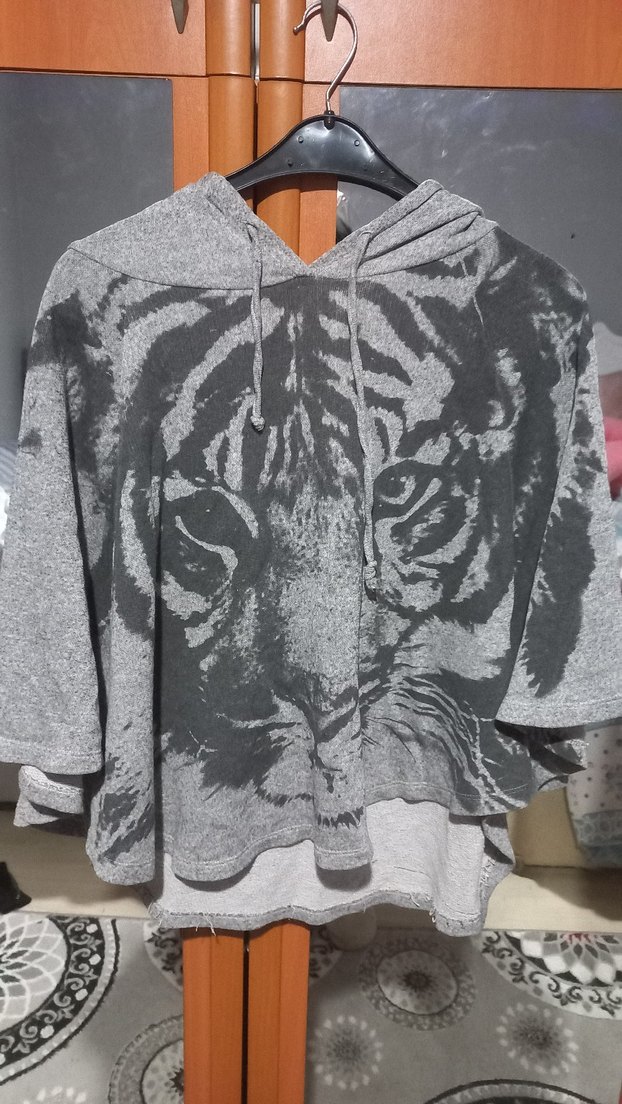Gri renkli, uzun kollu, kapüşonlu ve baskılı kadın panco. Yumuşak sentetik kumaştan, salaş kesim ve kürk detaylıdır. Rahat sokak stili için uygundur.