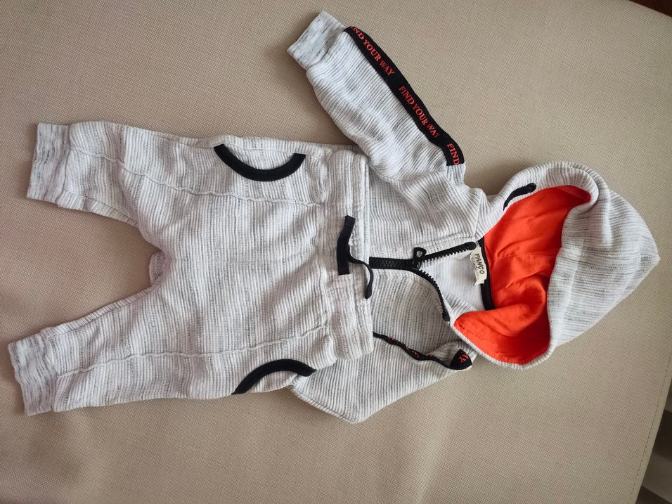 Kapüşonlu, fermuarlı ve uzun kollu gri bebek takımı, 0-6 ay .