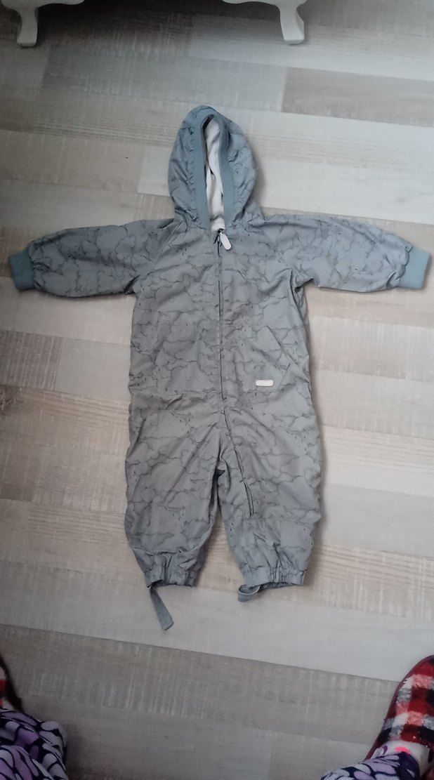 Kapüşonlu, yumuşak ve sıcak kumaştan yapılmış gri bebek kayak tulumu. Ön fermuar ve elastik manşetlere sahiptir, soğuk havalar için uygundur. ❄️