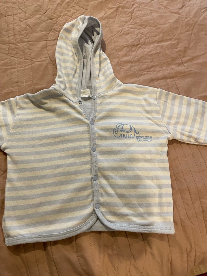 Uzun kollu ve düğmeli ön kapamalı bu gri bebek hırkası, yumuşak ve sıcak kumaştan üretilmiştir. Fil desenli ve kapüşonludur.