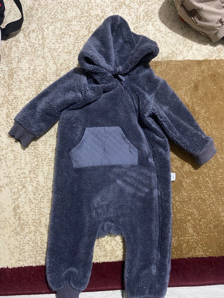 Gri renkli, kapüşonlu bebek tulumu, yumuşak ve sıcak kumaş ile detaylandırılmıştır. Önde cep ve sokak stili bulunur.