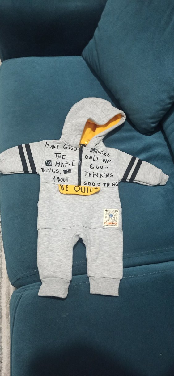 Gri renkli, kapüşonlu bebek tulumu. Yumuşak polar kumaştan, baskılı yazılar ve çizgili kollarla sokak stili sunar. Önden fermuarlıdır.