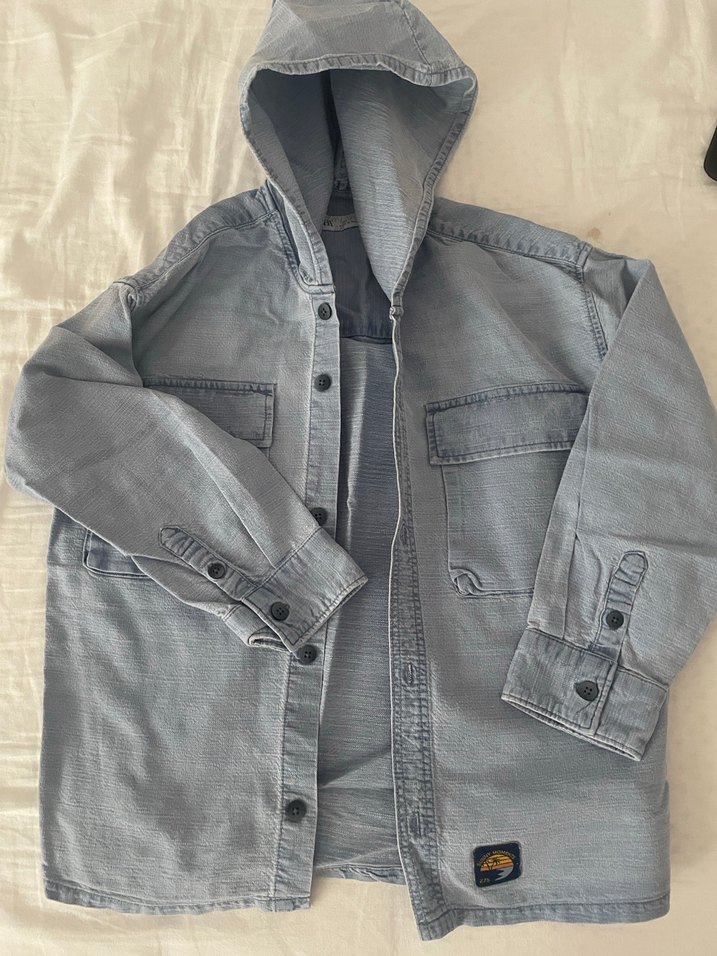 Gri denim kumaştan, bol kesim ve düğmeli ön kısmı olan, kapüşonlu erkek ceketi. Sokak stili için uygundur. Zara Marka