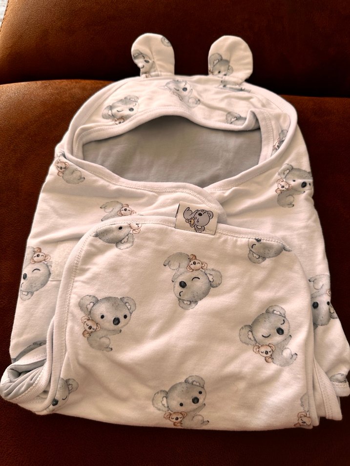 Kapüşonlu kulak detaylı, gri renkte, koala desenli yumuşak kundak
