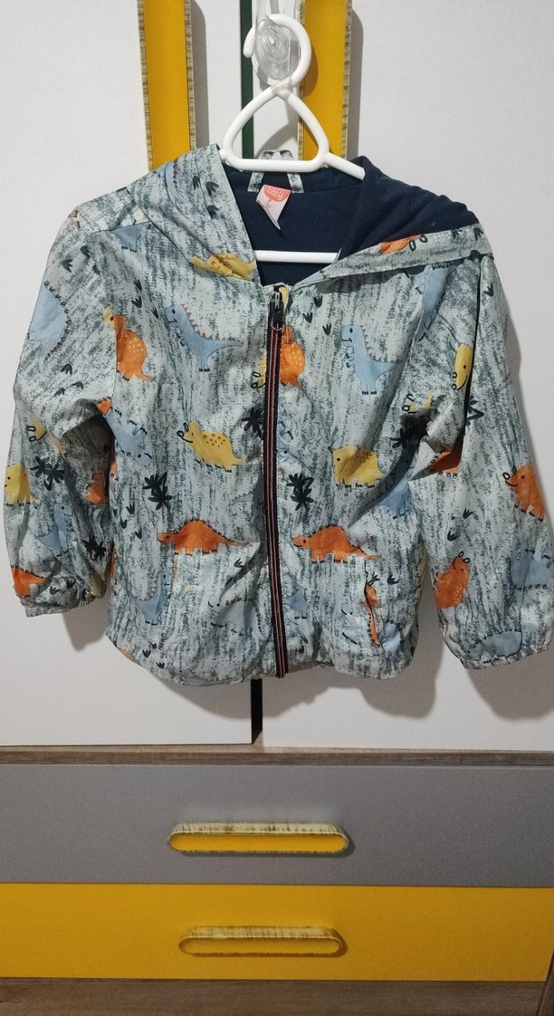 Kapüşonlu, fermuarlı ve bol kesim olan bu erkek yağmurluğu, gri batik deseni ve renkli dinozor baskılarıyla yumuşak ve sıcak polar kumaştan üretilmiştir. ️