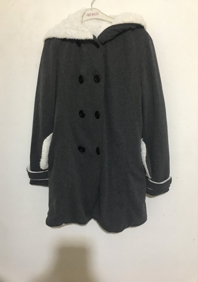 Gri renkli, çift sıra düğmeli, kapüşonlu ve kapşon ile ceplerinde beyaz yumuşak astar bulunan kaban. İçi peluş mont boy 75 en 50 esnek Kadın erkek unisex mont