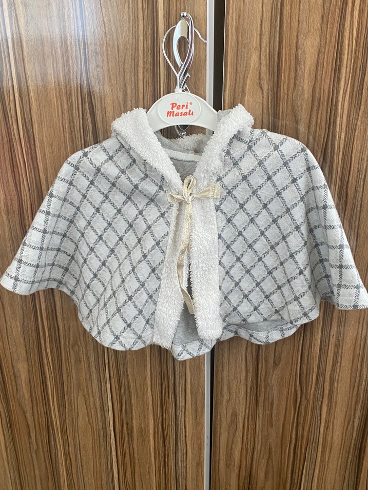Kapüşonlu ve uzun kollu, bol kesim kız pançosu. Yumuşak ve örgü dokulu gri ekose desenli polar kumaştan yapılmıştır.