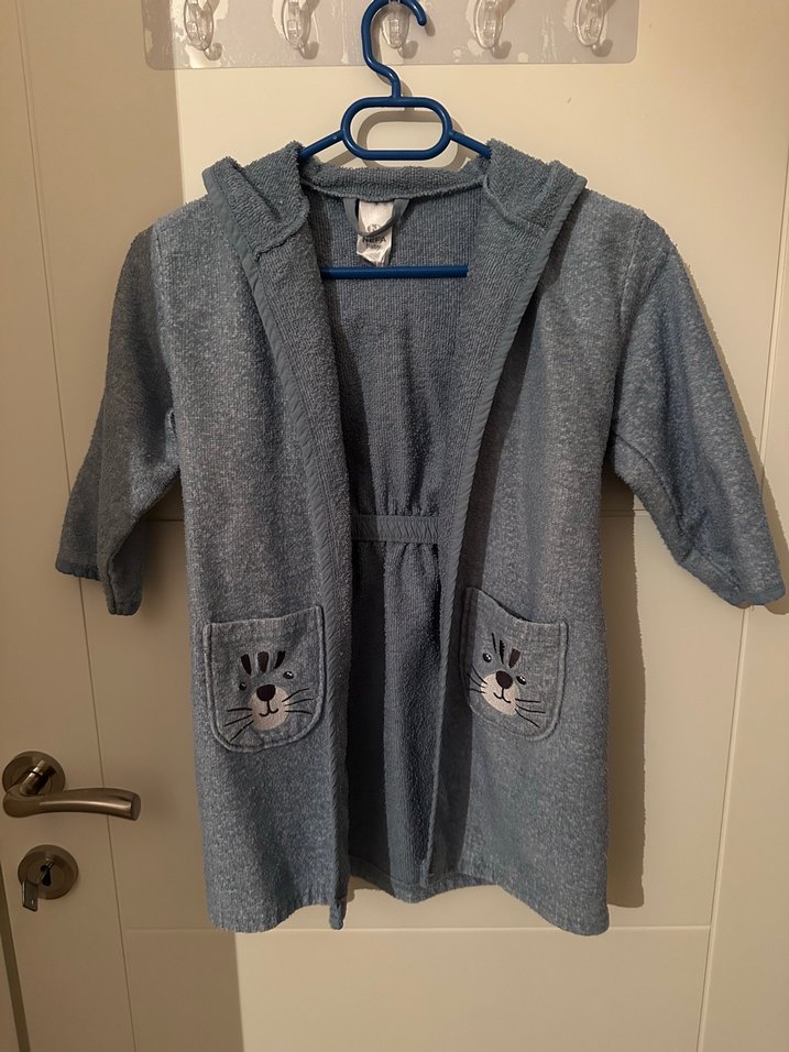 Kapüşonlu gri erkek çocuk bornozu, ön ceplerde hayvan yüzü baskılı, yumuşak ve emici kumaştan yapılmıştır. Defosu kusuru yoktur. İyi durumdadır. Bedeni: 92/98 cm Marka: Nefa