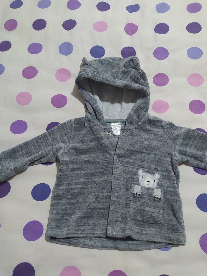 Kapüşonlu ve düğmeli, yumuşak ve sıcak gri kumaştan yapılmış erkek çocuk ceketi. Bol kesim ve cepten ayı figürü içerir, rahat kullanım için uygundur.