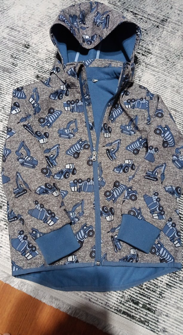 Kapüşonlu ve fermuarlı erkek içi polar çocuk yağmurluk, gevşek kesim ve inşaat araçları desenleriyle gri tonlarında yumuşak ve sıcak kumaştan üretilmiştir.