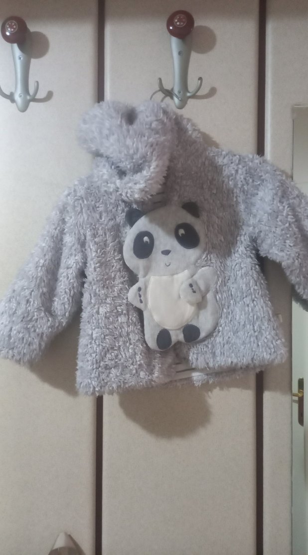 Kapüşonlu, kürklü detaylı ve baskılı panda desenli gri renkli, erkek çocuklar için dar kesim mont.