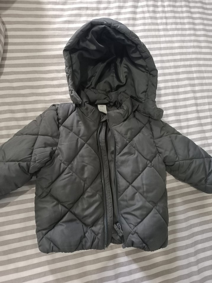 Kapüşonlu, fermuarlı ve düz gri erkek çocuk montu, yumuşak ve sıcak kumaştan, sokak stili için uygundur.6-9 ay 9-12