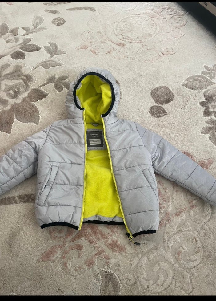 Kapüşonlu, gri renkli, erkek çocuk için uygun, içi yumuşak ve kürklü detaylı, fitted kesim ve streetwear tarzında mont. 5.6 yaşa uygundur