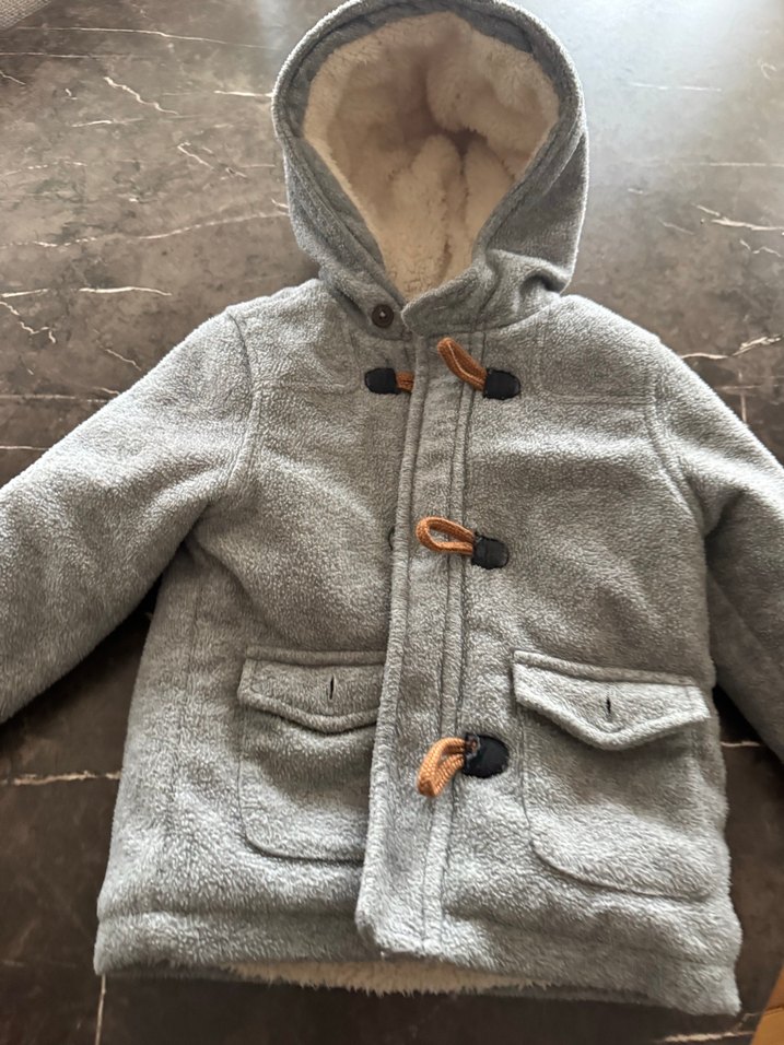 Kapüşonlu, düğmeli ve cepli, yumuşak ve sıcak kumaştan yapılmış gri erkek çocuk mont, rahat bir kesime sahiptir.