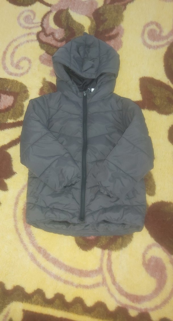Kapüşonlu ve fermuarlı, gri renkli, yumuşak ve sıcak kumaştan yapılmış erkek çocuk montu. Streetwear tarzında, dar kesim.