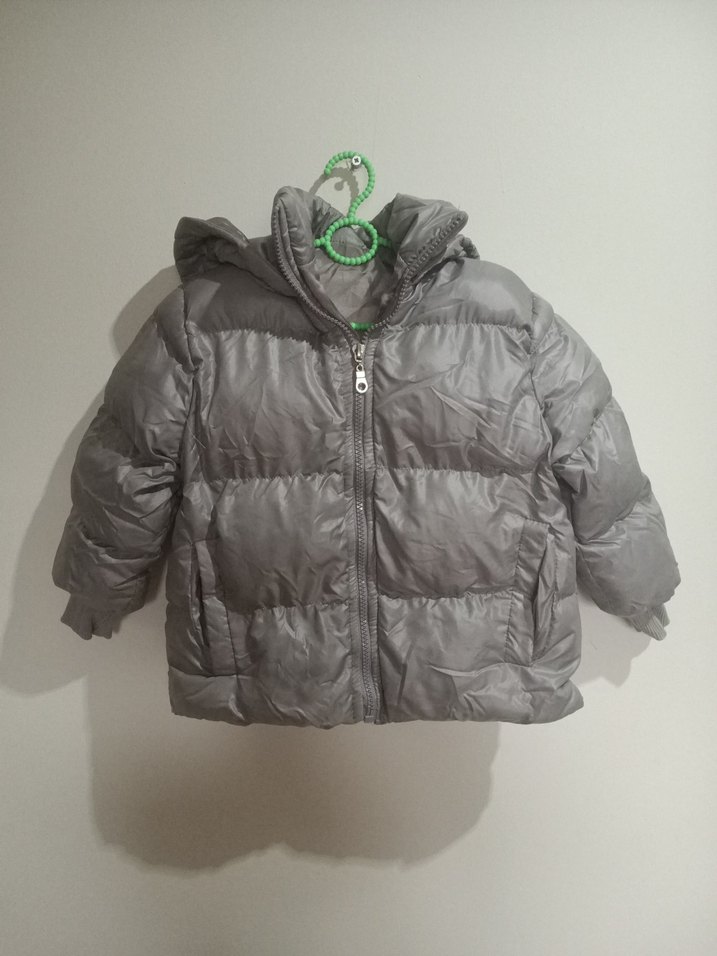 Kapüşonlu, düğmeli ve ince kesime sahip gri erkek çocuk montu. Yumuşak ve sıcak kumaştan üretilmiştir.