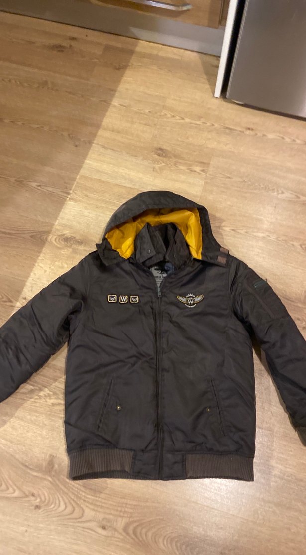 Sarı kapüşon astarlı, baskılı detaylı, uzun kollu, gri, ince kesim erkek mont. Günlük sokak stili için uygun, içi kürklü ve midi boyda.
