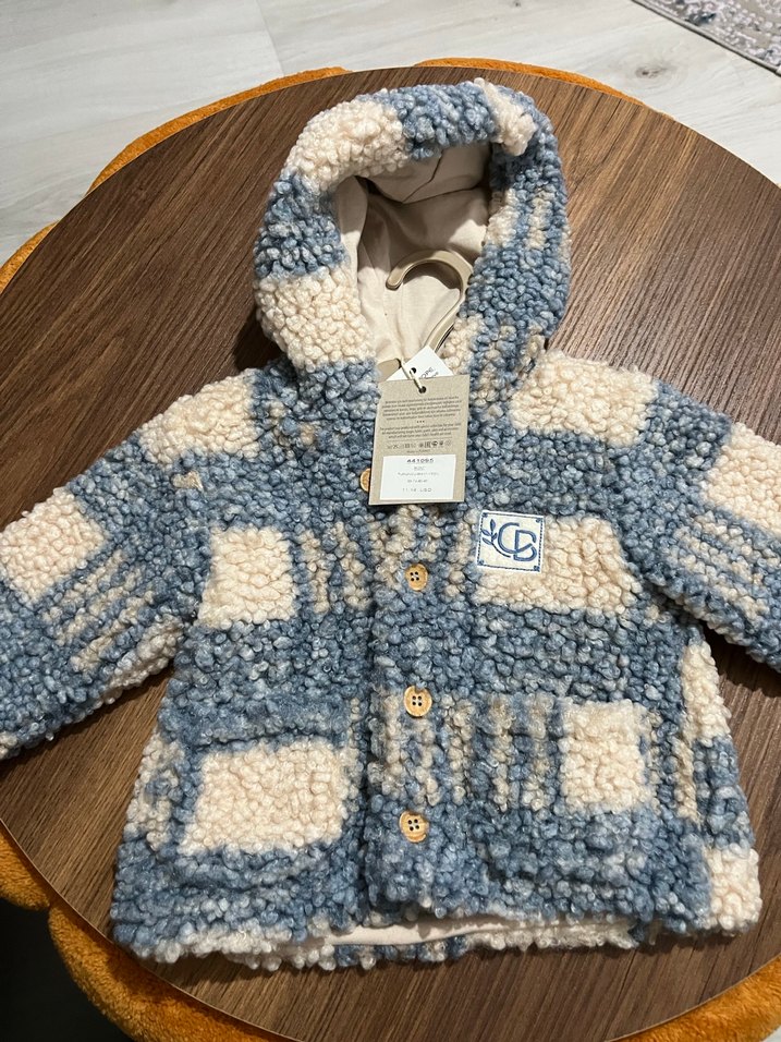 Gri tonlarında, kapüşonlu ve bol kesim örgü dokulu erkek çocuk montu. Yumuşak ve sıcak kumaştan üretilmiştir.