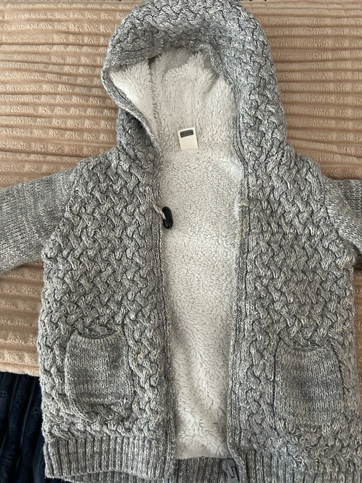 Fitted kesim, kapüşonlu ve uzun kollu gri erkek çocuk triko hırka, yumuşak ve sıcak iç astarlı, sade ve örme dokuda.