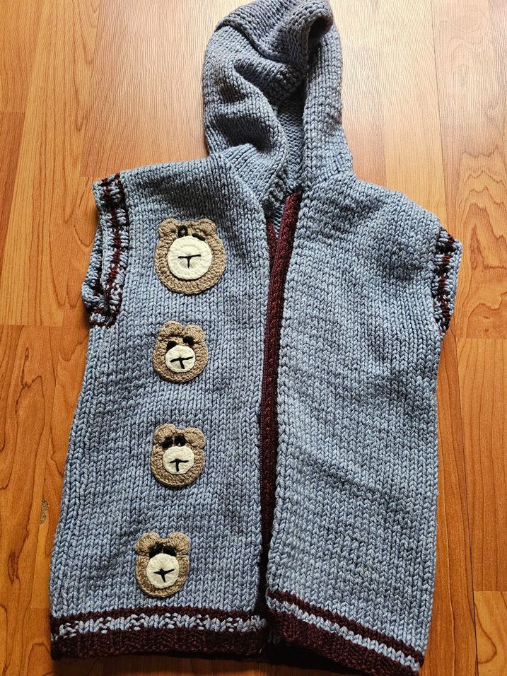 Kapüşonlu, gri renkli, nakışlı ayıcık desenli, regular fit, kolsuz örme triko yelek. el örgüsü 4 6 yaş uyumludur