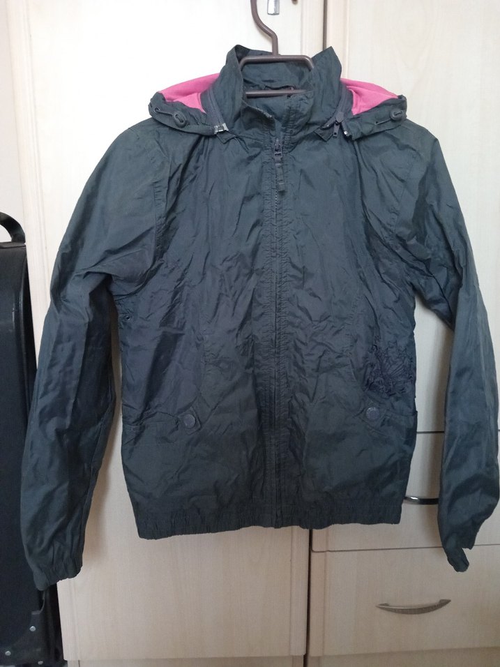 Kapüşonlu ve fermuarlı gri kadın ceketi, bol kesim ve uzun kolludur. Sentetik kumaştan, normal midi uzunluğunda ve dış mekan kullanımı için uygundur.