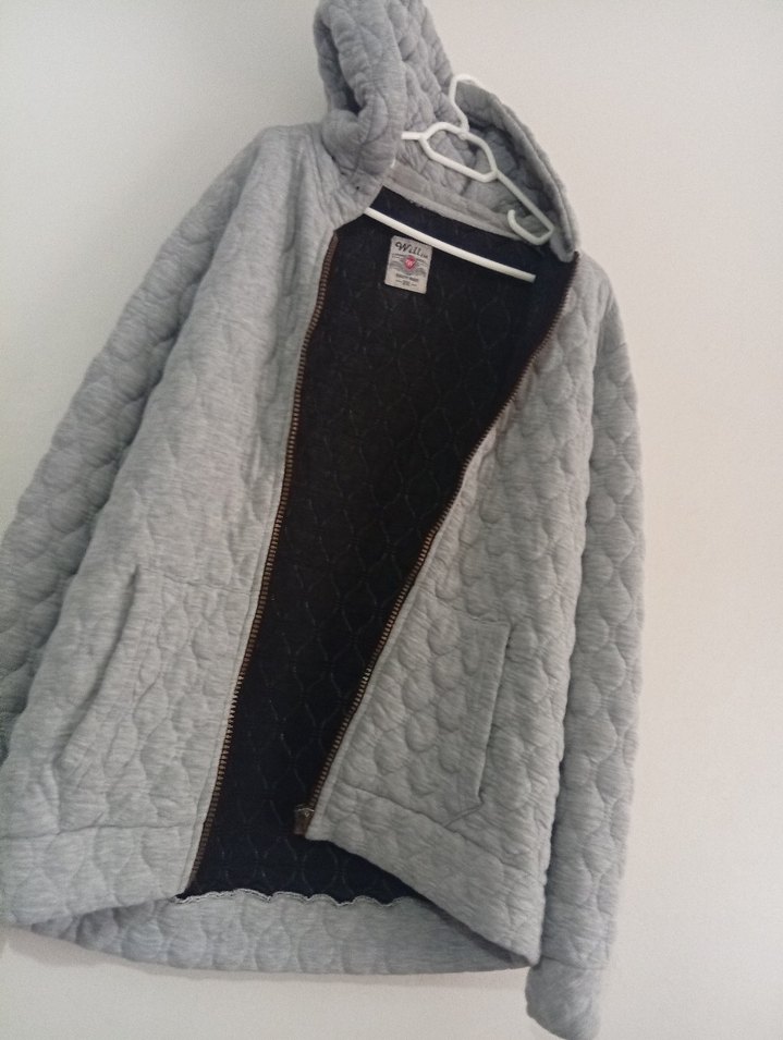 Kapüşonlu ve fermuarlı gri kadın ceketi, yumuşak ve sıcak kumaştan yapılmıştır. Bol kesim, uzun kollu ve midi boydadır, rahat sokak stili için uygundur. fermuar bozuk