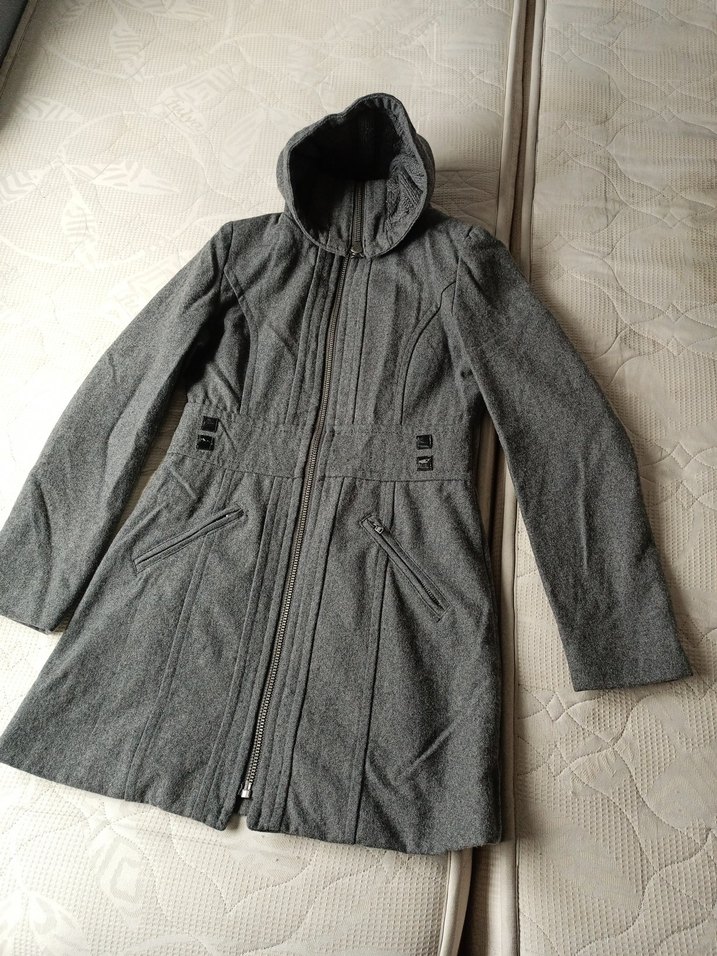 Kapüşonlu, bel kısmında tokalı detaylara sahip gri kadın kaban. Uzun fermuarlı ve yan cepli, yumuşak ve sıcak kumaştan üretilmiştir.