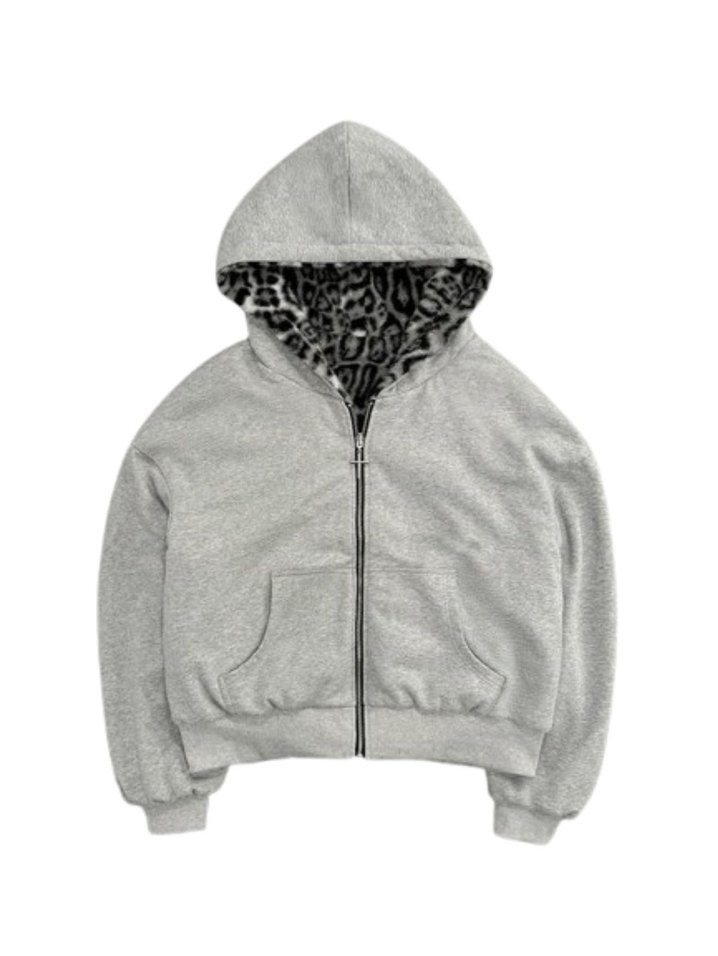 Gri kapüşonlu sweatshirt, uzun kollu ve bol kesimdir. İç kapüşonda zebra desenli yumuşak kürk detay bulunur. Rahat ve günlük kullanıma uygundur.