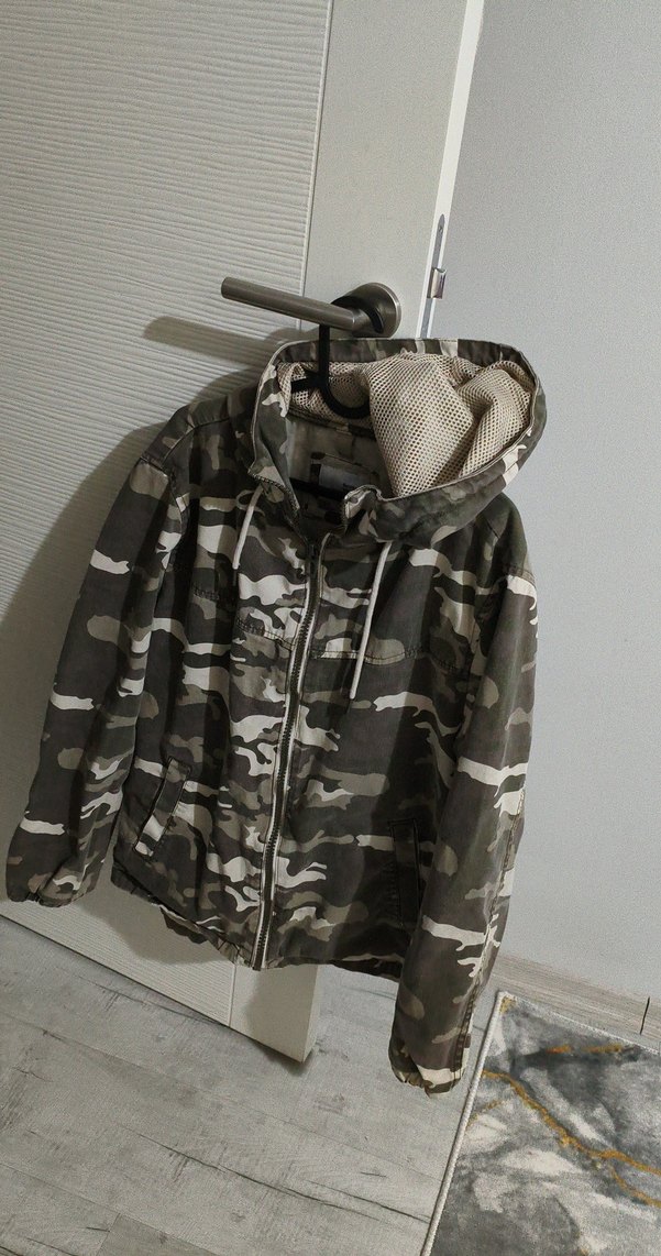 Gri kamuflaj desenli, kapüşonlu ve fermuarlı kadın ceket. Sentetik kumaştan, normal midi boyda ve salaş kesim, sokak stili için uygun.