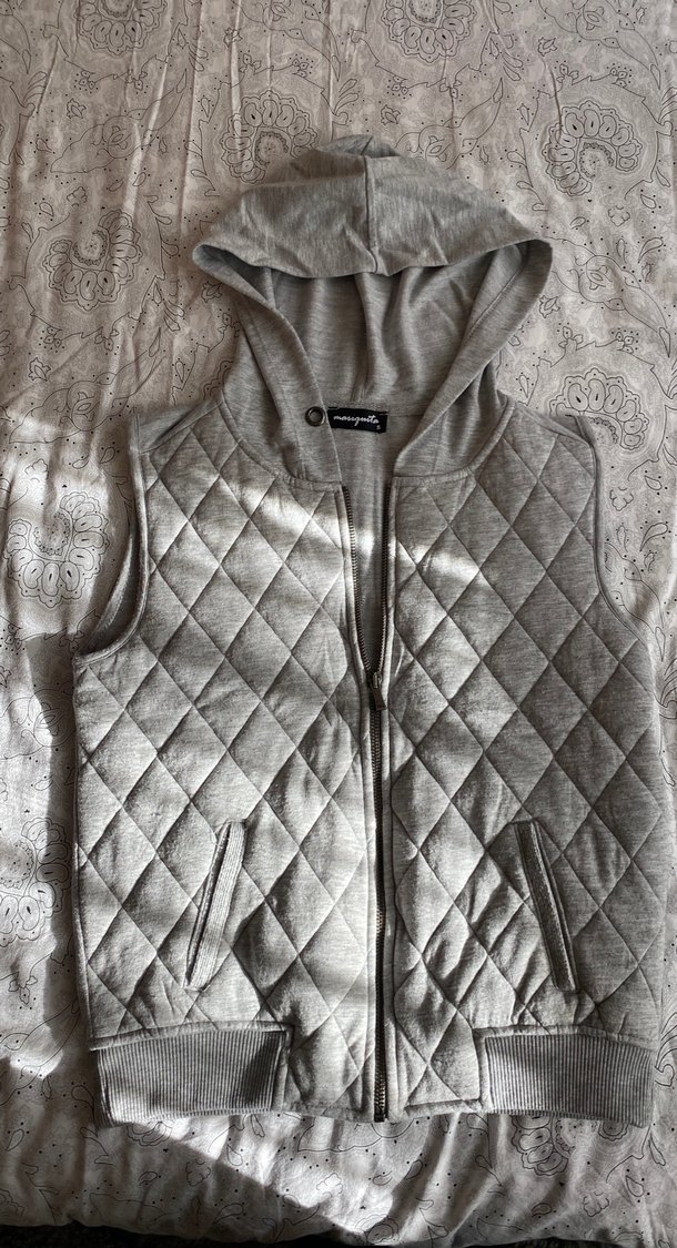 Kapüşonlu, fermuarlı, yüksek yakalı gri kadın yelek. İnce kesimli ve kapitone detaylı, rahat günlük kullanıma uygun.