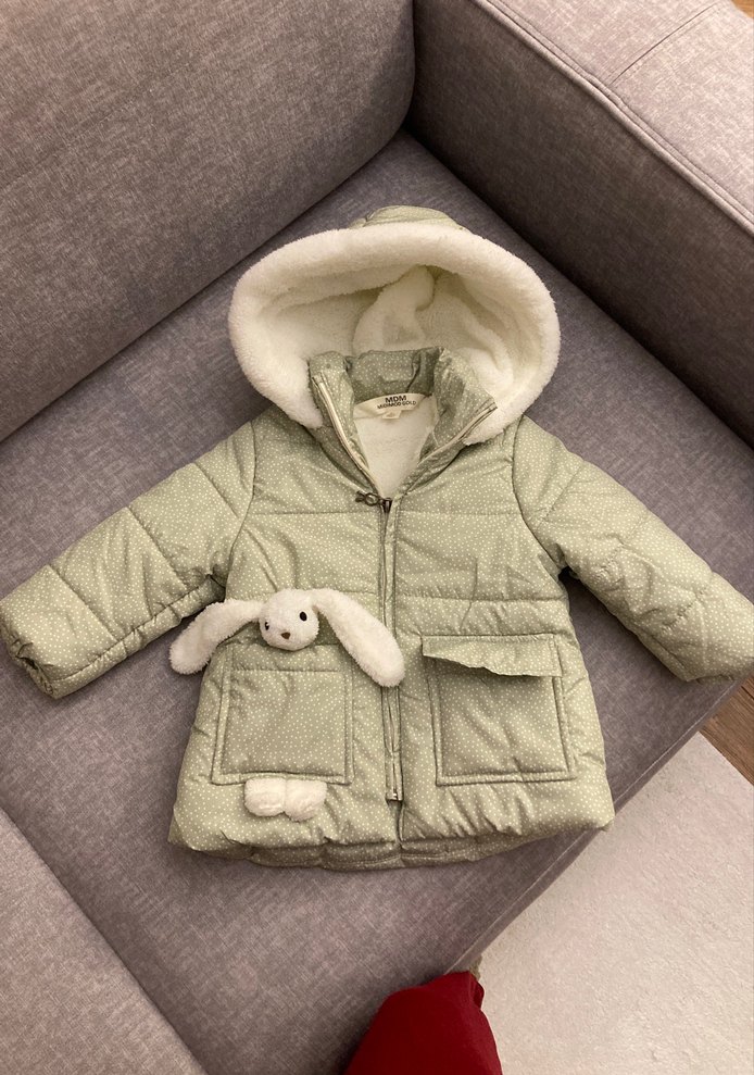 Kapüşonlu, içi kürklü yeşil kız bebek montu, nakış detaylı ve ön ceplerinden biri tavşan figürlü. Yumuşak ve sıcak kumaştan yapılmıştır.