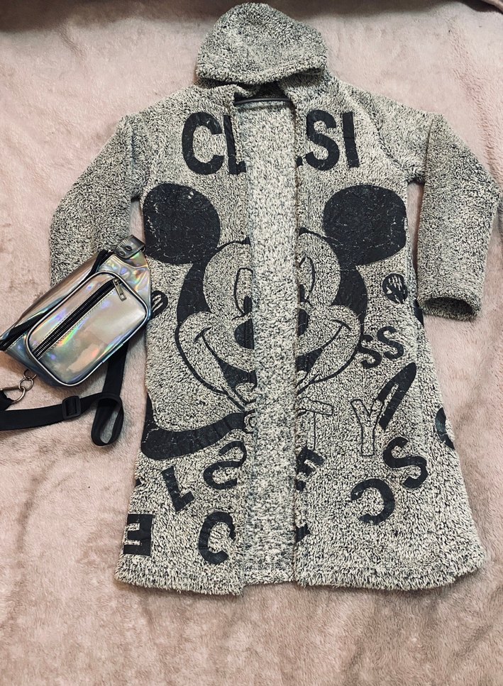 Kapüşonlu, uzun kollu, bol kesim gri hırka. Yumuşak ve sıcak dokuda, Mickey baskılı örme kumaştan yapılmıştır.