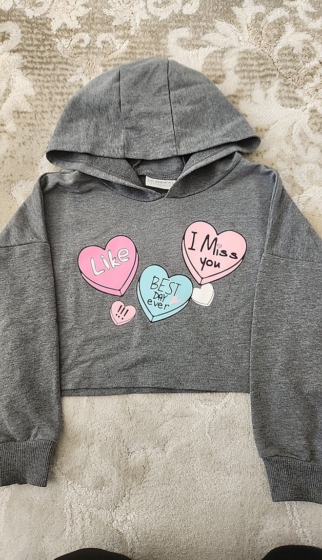 Gri kapüşonlu kız sweatshirtü, uzun kollu ve bol kesimdir. Yumuşak, sıcak kumaştan yapılmış olup, 'Like', 'I Miss you' ve 'Best day ever' yazılı renkli kalp baskıları vardır. Örgü manşetler ekstra rahatlık sağlar.