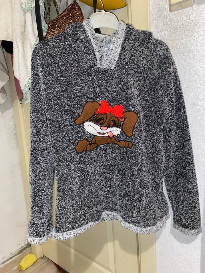 Gri kapüşonlu kız kazağı, bol kesim ve nakışlı köpek deseni ile dikkat çeker. Yumuşak, sıcak triko kumaştan üretilmiştir, rahat sokak stili için uygundur.