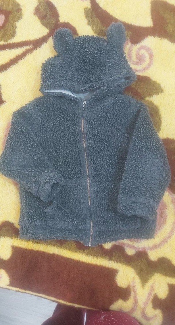 Kapüşonlu ve fermuarlı, yumuşak kürk detaylı gri renkli kız çocuk ceketi. Rahat ve şık sokak stili için uygun bir parçadır.
