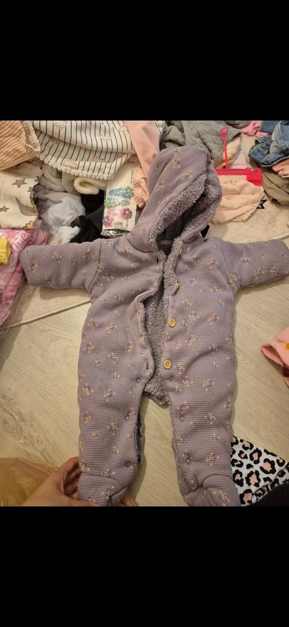 Kapüşonlu, gri renkli, nakış detaylı ve içi yumuşak kürk ile kaplanmış bebek tulumu. ❄️