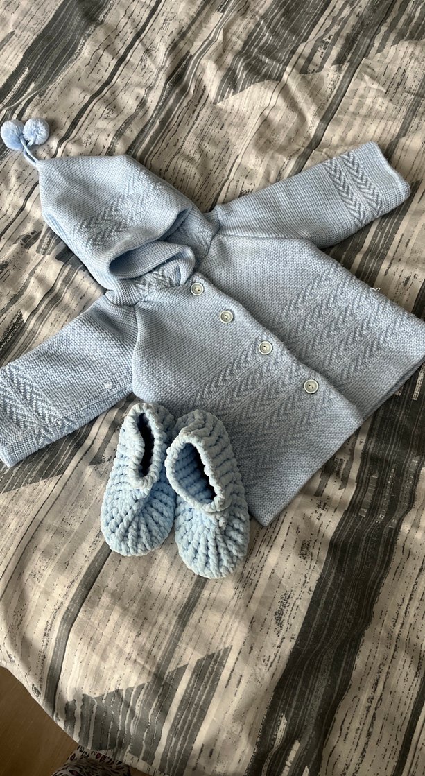 Gri renkli, kapüşonlu uzun kollu örgü bebek takımı ve yumuşak patiklerden oluşur. Rahat ve sıcak tutan örgü kumaş kullanılmıştır. Ürünün defolu yoktur
