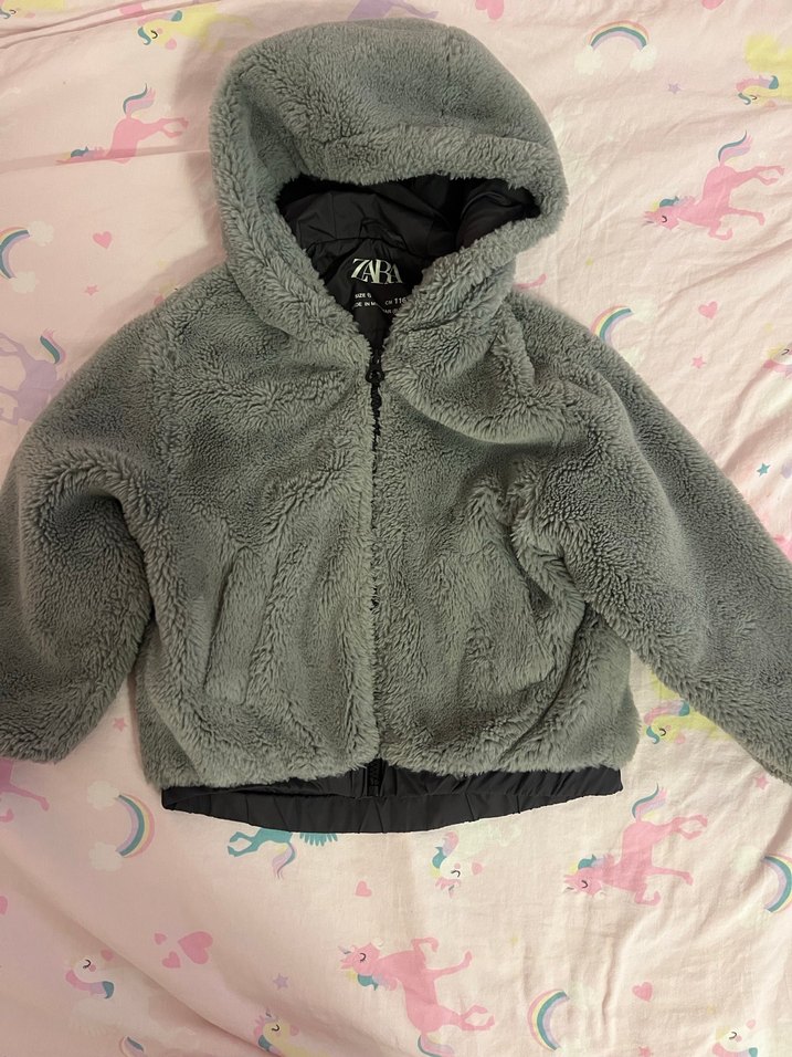 Kapüşonlu, bol kesim gri peluş kız ceketi. Sokak stiline uygun, yumuşak kürk detaylı rahat bir model. Zara