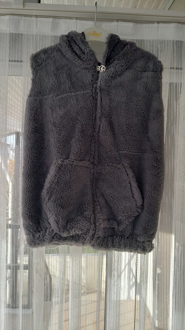 Gri renkli, kapüşonlu ve kolsuz kız yeleği, yumuşak peluş kumaş ve bol kesim ile rahat sokak stili sunar.