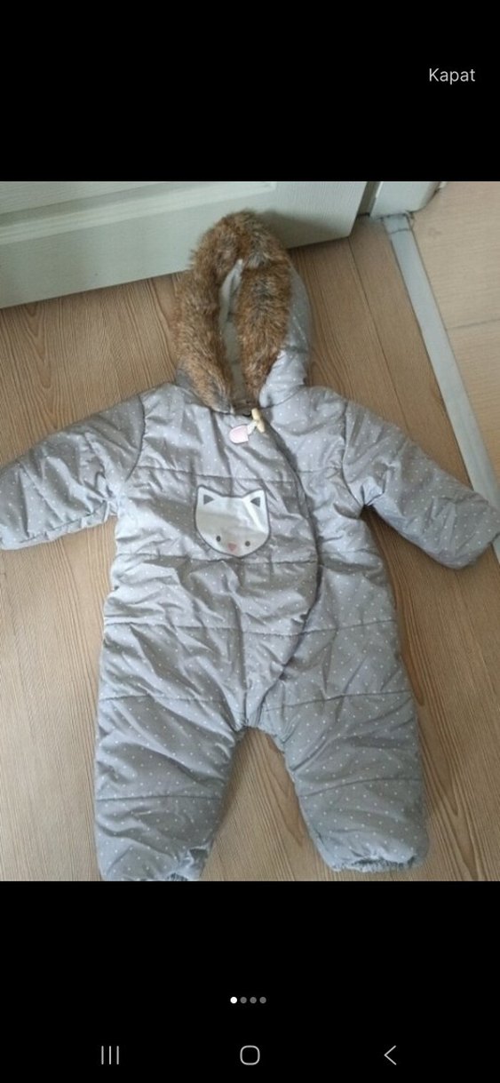 Kapüşonlu, tüylü detaylı gri bebek tulumu, önünde küçük hayvan yüzü figürü ve yumuşak, sıcak kumaş içerir. ❄️