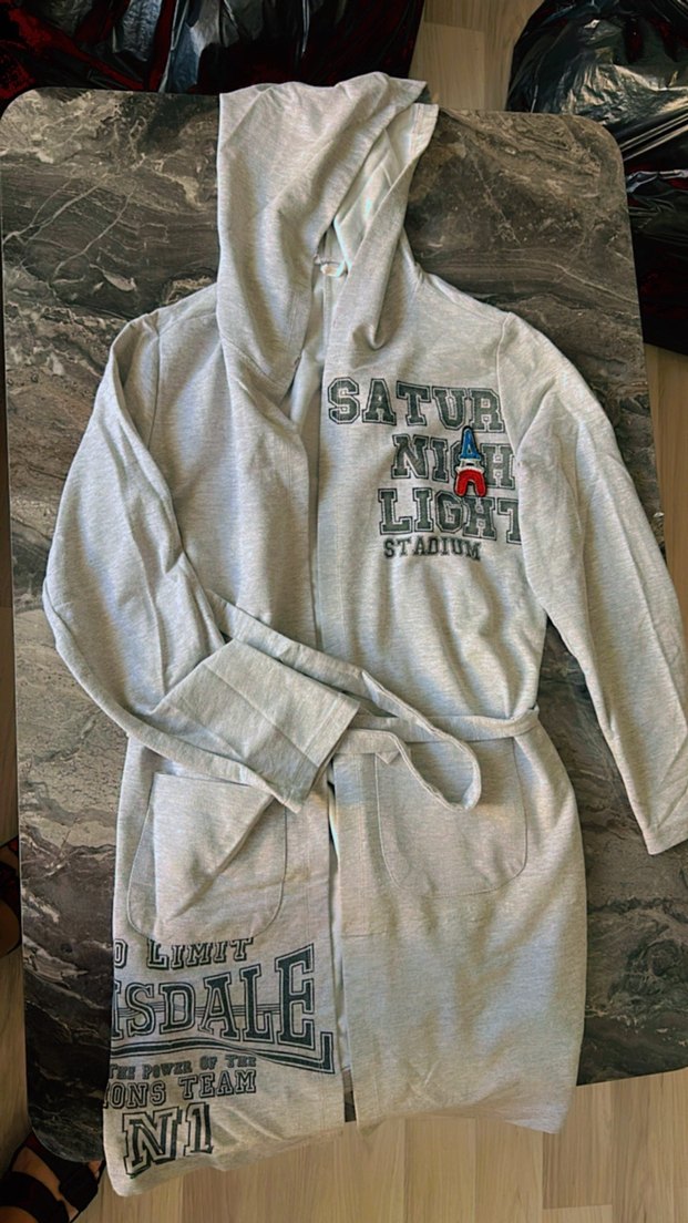 Kapüşonlu, uzun kollu, baskılı yazılı ve grafik detaylı gri . Kuşaklı, yumuşak ve rahat kumaştan yapılmıştır.