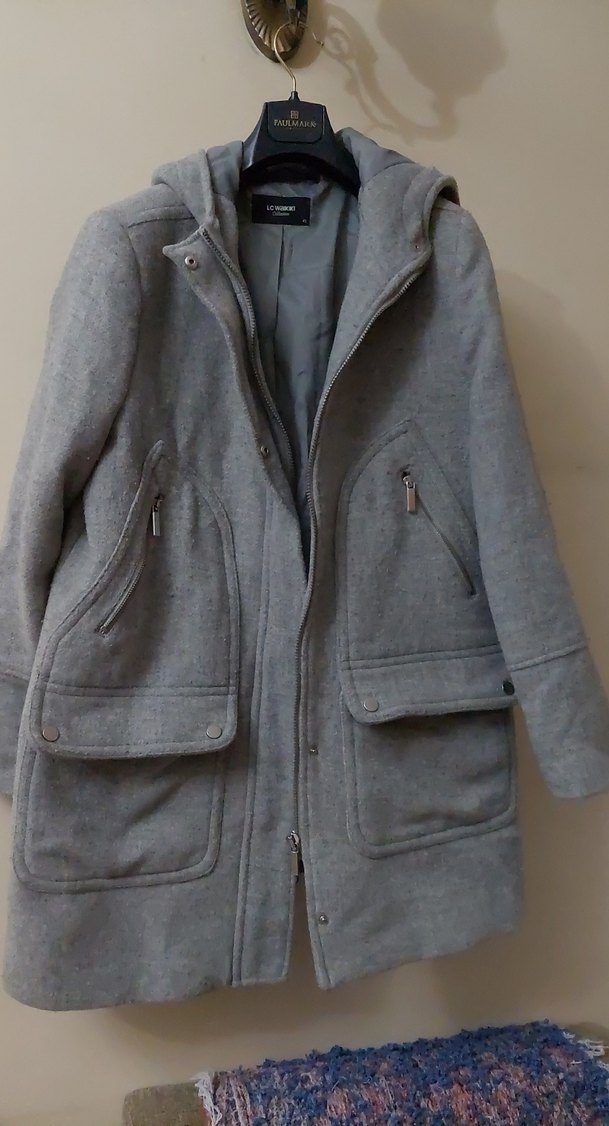 Kapüşonlu, fermuarlı ve çıtçıtlı cepleri olan uzun gri kaban. Soğuk havalar için yumuşak ve sıcak tutan kumaş kullanılmış.