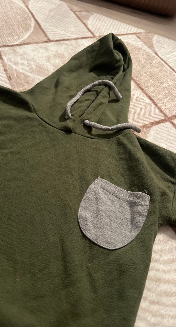 Yumuşak kumaşlı, kapüşonlu haki bebek taşıma önlüğü, gri cep detayıyla rahatlık ve işlevsellik sunar.