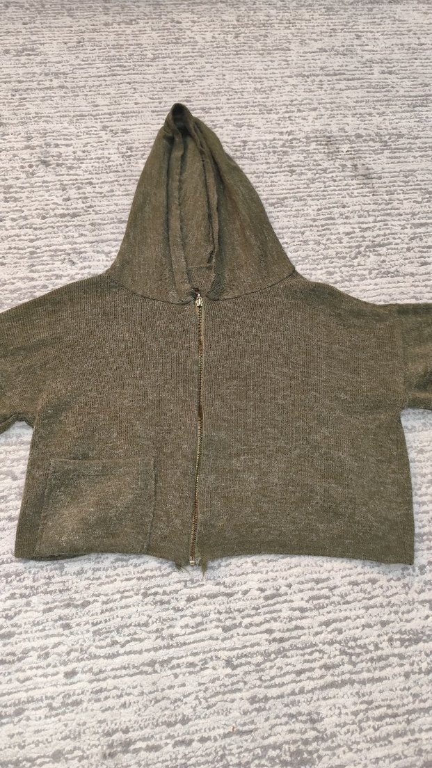 Bu haki triko, kapüşonlu, uzun kollu ve bol kesimdir. Yumuşak keten kumaştan yapılmış, sade ve desen içermeyen günlük kullanıma uygun bir üründür. Standart beden.