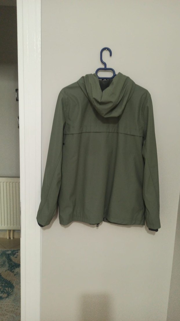 Kapüşonlu, fermuarlı, uzun kollu, bol kesim haki ceket. Yumuşak ve sıcak dokulu kumaştan, dış mekan kullanımı için uygundur.