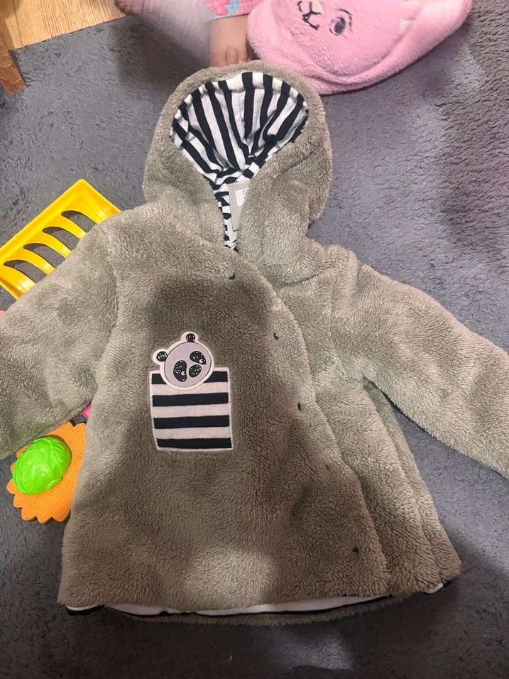 Fermuarlı, kapüşonlu, yumuşak ve sıcak kumaştan yapılmış, kürk detaylı haki erkek çocuk mont. İç kapüşonda zebra deseni ve ön cepte panda figürü bulunur.
