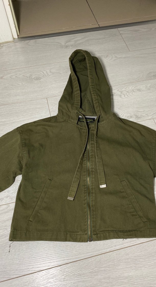 Rahat kesim, kapüşonlu ve fermuarlı haki keten ceket, uzun kollu ve günlük kullanım için uygun.