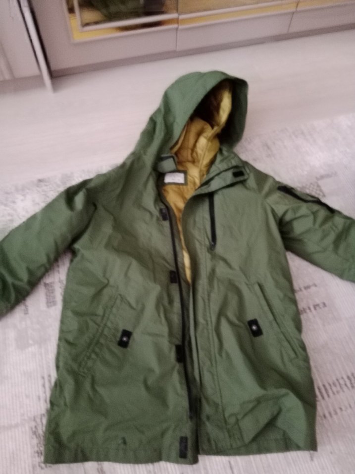 Kapüşonlu, fermuarlı, bol kesim haki kadın parka. Uzun kollu, midi boy ve yumuşak, sıcak tutan kumaştan üretilmiştir.