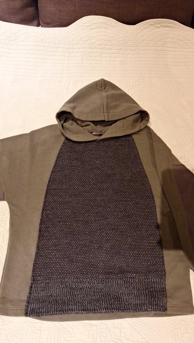 Kapüşonlu yakalı, uzun kollu kadin sweatshirt. Yumuşak sentetik kumaştan örülmüş ön paneli vardır. Salaş kesim ve normal uzunluktadır, günlük sokak stili için uygundur. XS-beden ama geniş kesim.