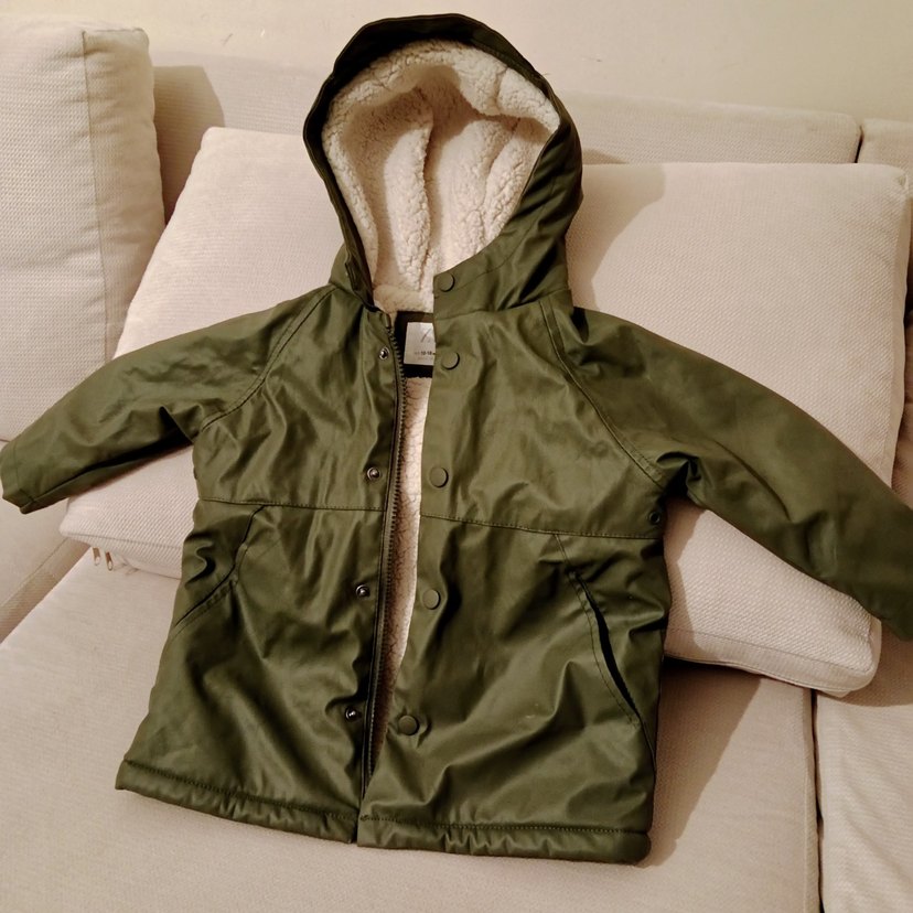 Zara kız erkek bebek için uyumlu kapüşonlu haki çocuk montu, yumuşak ve sıcak yün astarlı, fit kesimlidir.